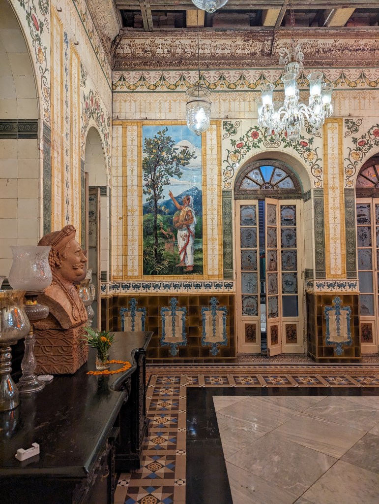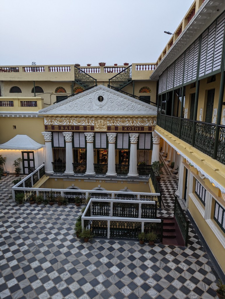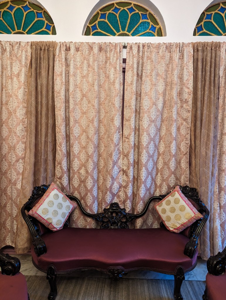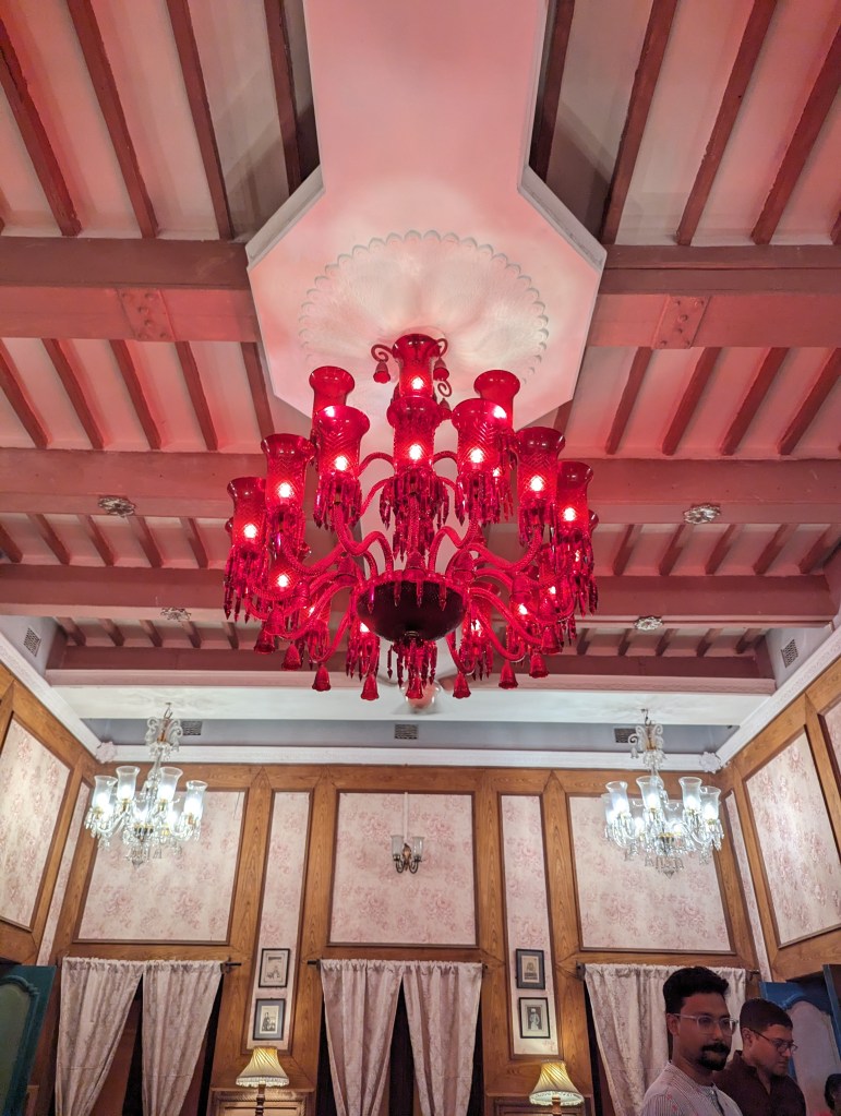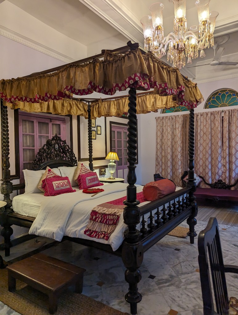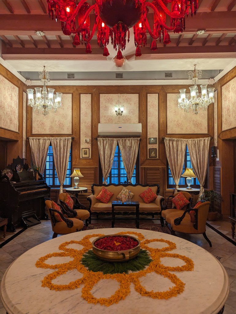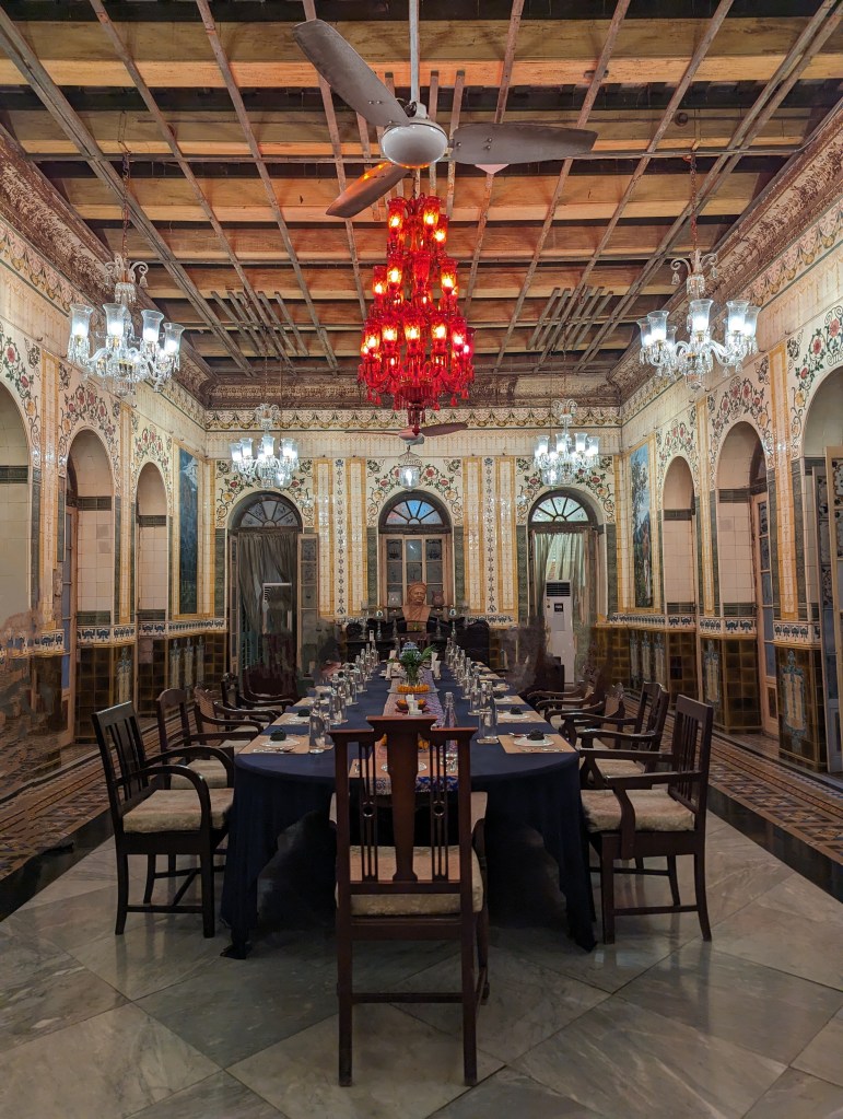 અમને લંચ પીરસાયું એક વિશાળ ડાઇનિંગ રુમમાં! જાત જાતની કળા કારીગરી અને દેશ-વિદેશનાં મટીરિયલથી એ આખો રુમ સુશોભિત હતો! છત તો આપણાં આજનાં બે માળ બની જાય તેટલી ઊંચી એટલે અંદર પ્રવેશતાની સાથે જ તમને ભવ્યતા અનુભવાય. ત્યાં અમારી સાથે બેઠાં એ પ્રોપર્ટી નાં મેનેજર – અભિરૂપ. તેમણે અમને પીરસાયેલી વાનગીઓ, આ હવેલી અને આખાં વિસ્તારનાં ઈતિહાસ વિશે ખૂબ સરસ માહિતિ આપી.