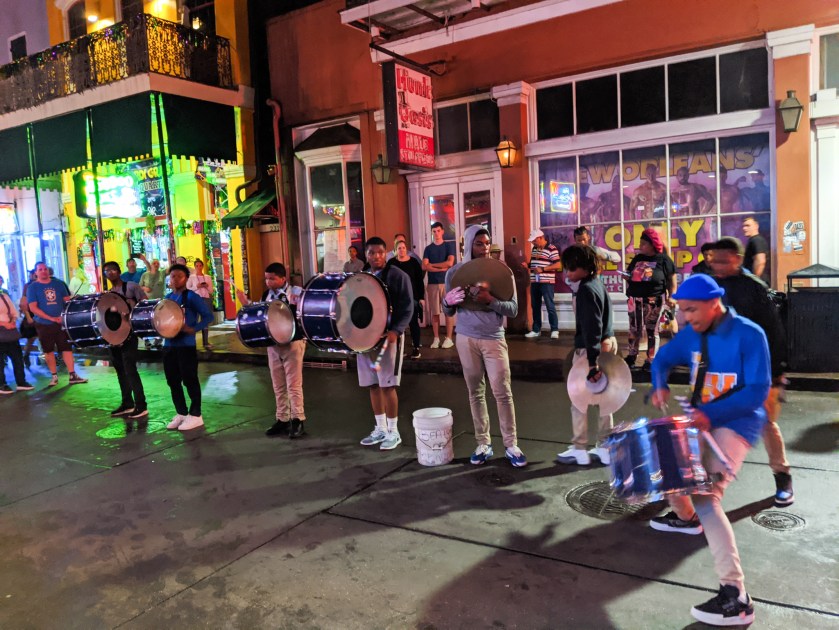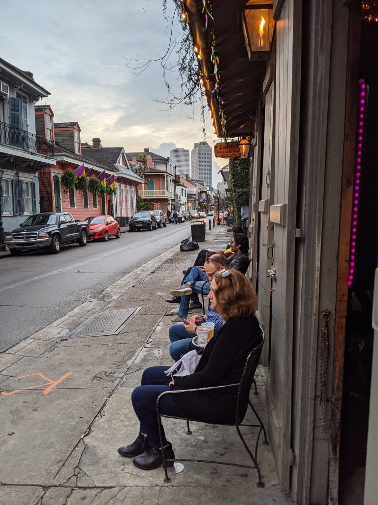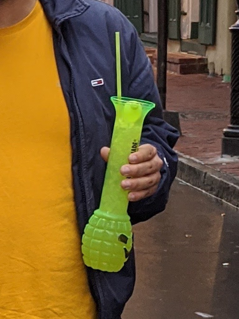 આગળ ઉલ્લેખ કર્યો તેમ આ શહેર અમૅરિકાનાં બહુ ઓછાં શહેરોમાંનું એક છે જ્યાં જાહેર સ્થળો પર પણ શરાબ પીવાની અનુમતિ છે. હૅન્ડ ગ્રેનેડ જેવાં દેખાતાં એક મોટાં ફ્લાસ્કમાં ત્યાં કૉકટેઈલ્સ મળતાં હતાં જે અમારી આસપાસ ઘણાં લોકો પી રહ્યા હતા. એ જોઈને સૅમને પણ એક ગ્રેનેડ કૉકટેઇલ પીવાનું મન થયું. અમે એક નાનકડી કૉકટેઈલ્સની દુકાન જોઈ, જ્યાંથી રીતસર સ્ટ્રીટ-ફૂડની જેમ લોકો કૉકટેઇલ્સ ખરીદી શકતા હતા! સૅમે ત્યાંથી એક ગ્રેનેડ કૉકટેઇલ ખરીદ્યું અને મને આશ્ચર્ય એ વાતનું છે કે, તેણે એ પૂરું પણ કર્યું! અને એ કૉમેન્ટ તેની ક્વોન્ટિટી વિષે નહીં, સ્વાદ વિષે છે. ;)