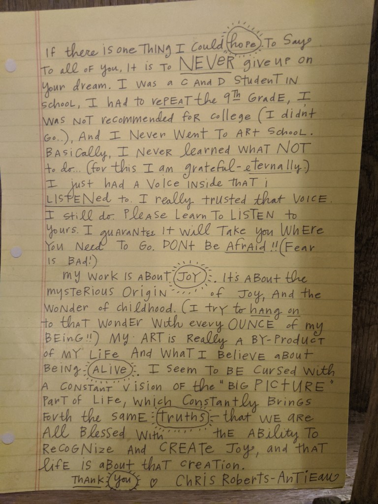 એ સિવાય અમે એક-બે નાની આર્ટ ગૅલેરીઝમાં પણ લટાર મારી. અમારાં એરબીએનબીમાં સુંદર લખાણવાળું એક પેપર પડ્યું હતું. એ જ અમને ત્યાંની એક આર્ટ ગૅલેરીમાં પણ જોવા મળ્યું ત્યારે ફેવરિટ સ્કુલ ટીચર અચાનક મેળામાં દેખાઈ જાય તેવું કુતુહલ અમને થયું હતું અને અંદર જઈને ખબર પડી કે, આ નોટ જેણે લખેલી છે તે ક્રિસ રૉબર્ટ્સ – એન્ટીઓની જ એ આર્ટ ગૅલેરી હતી, જ્યાં અમે ઊભા હતા!