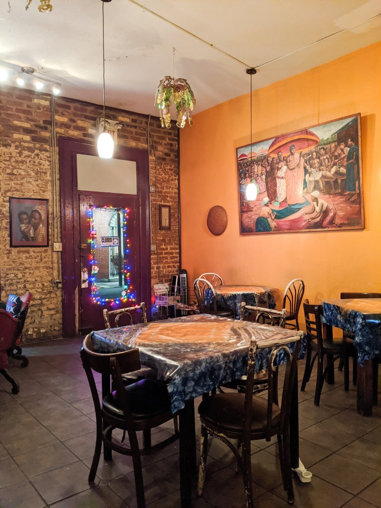 ગામ્બિયા અને કેમરુનની અમુક ટ્રેડિશનલ રેસિપીઝ અમને આ રેસ્ટ્રોંમાં માણવા મળી. તેમનું ડેકોર પણ મસ્ત રંગબેરંગી હતું!