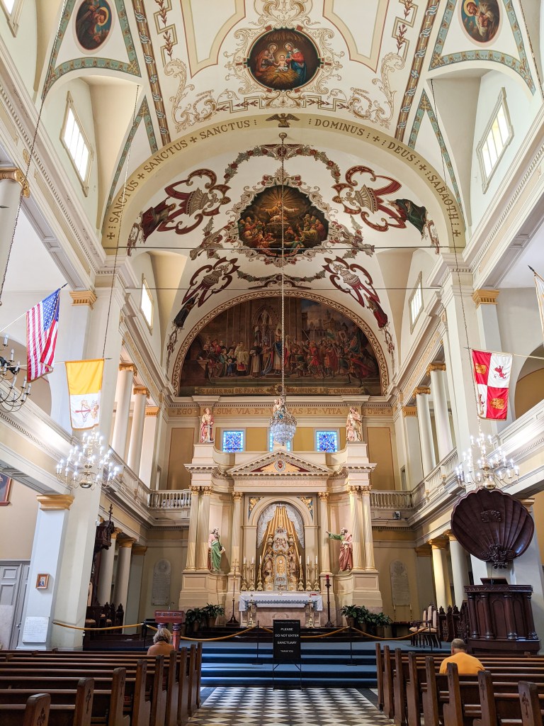 અંદરની જગ્યા થોડી નાની હતી એટલે અમે થોડી વારમાં જ કંટાળી ગયા અને ફ્રેન્ચ કવૉર્ટર્સ પાછા ફર્યા. સામે જ બરાબર સેઇન્ટ લુઈસ કથીડ્રલ હતું, જે અમારે પરેડવાળાં દિવસે અંદરથી જોવાનું બાકી રહી ગયું હતું. લંચ ટાઇમ લગભગ થઇ જ ગયો હતો અને અમે થોડી વાર રખડી શકીએ તેમ હતા એટલે અમે કથીડ્રલમાં અંદર ગયા. હજુ અમે જોતા જ હતા કે, ત્યાં એક પાદરી આવીને અમારી સાથે વાતો કરવા લાગ્યો અને તેમનું ચર્ચ કેટલું સારું છે એ વિષે અમને કહેવા લાગ્યો. અમે પૂછ્યું, હરિકેન કૅટરીના વખતે પણ ચર્ચે લોકોની મદદ કરી હતી કે? પછી તેણે ગોળ ગોળ જવાબ આપ્યા અને સમજી ગયો કે, અહીં બહુ લપ કરવા જેવી નથી. ધાર્મિક સ્થળોમાં અમારો રસ તેમનાં આર્કિટેક્ચર પૂરતો સીમિત છે અને તે દૃષ્ટિએ આ ચર્ચ ખરેખર સુંદર હતું.